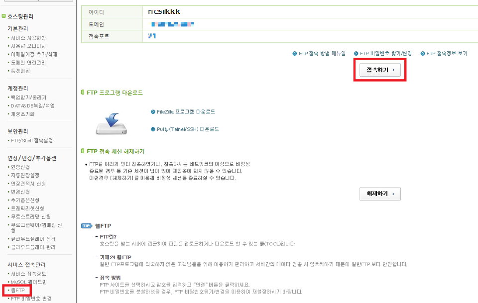 아래와 같이 웹 FTP로 접속하셔도 되고 저같은 경우는 알드라이브를 이용하여 접속했습니다.