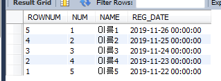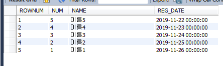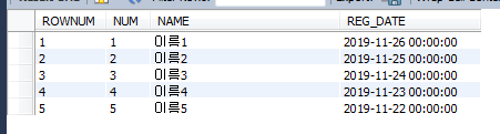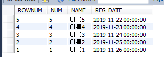 결과값을 보면 REG_DATE를 오름차순으로 ROWNUM을 매기고 이를 역순으로 출력합니다.