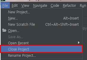 기존에 프로젝트를 닫고 파이참 시작화면으로 이동합니다.
