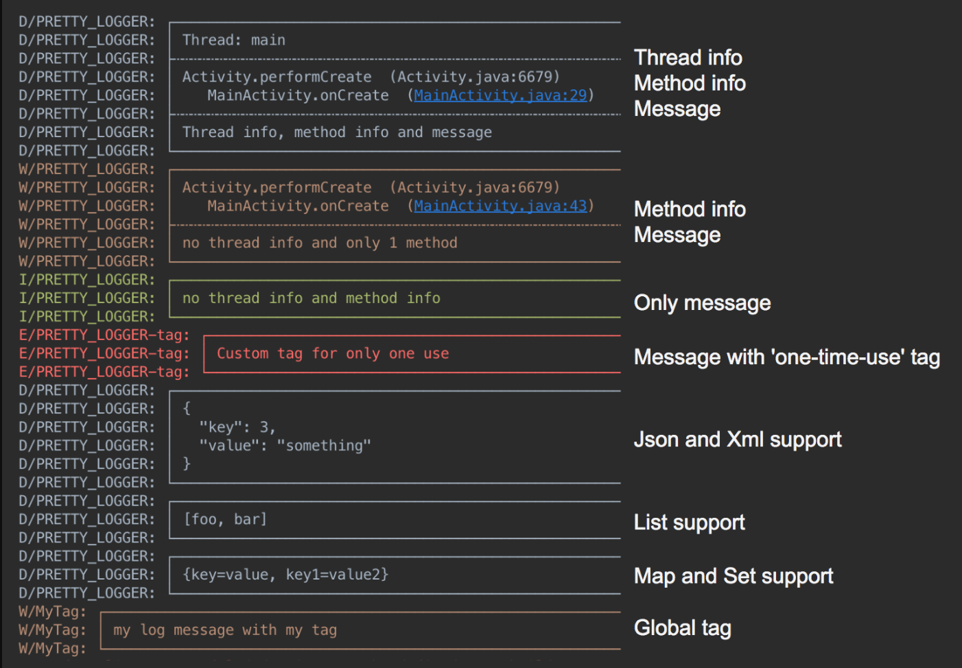 Logger.addLogAdapter(new AndroidLogAdapter());
