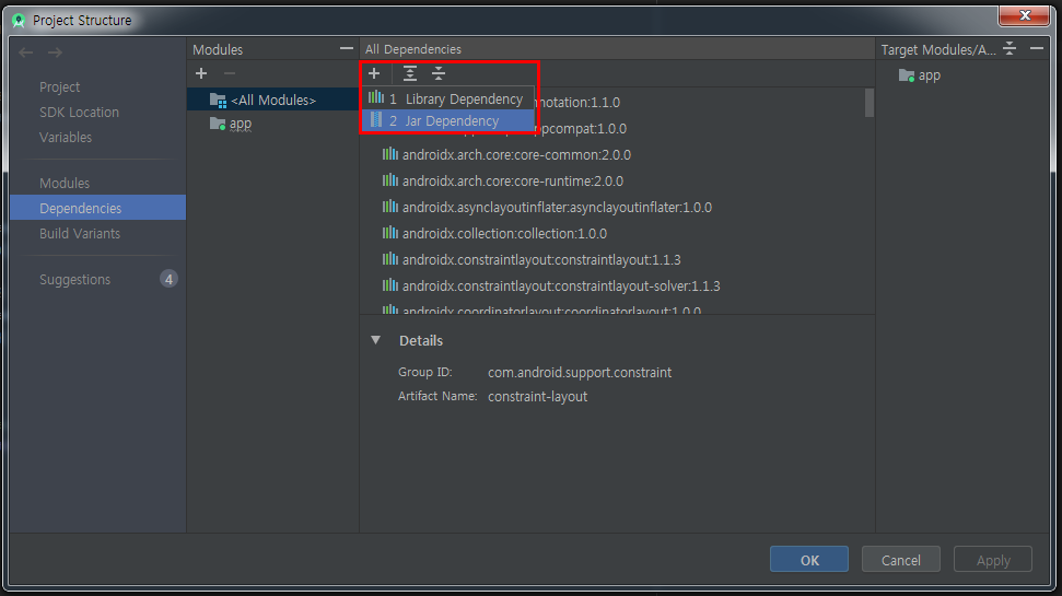 [+] -> [Jar Dependency]를 클릭합니다.