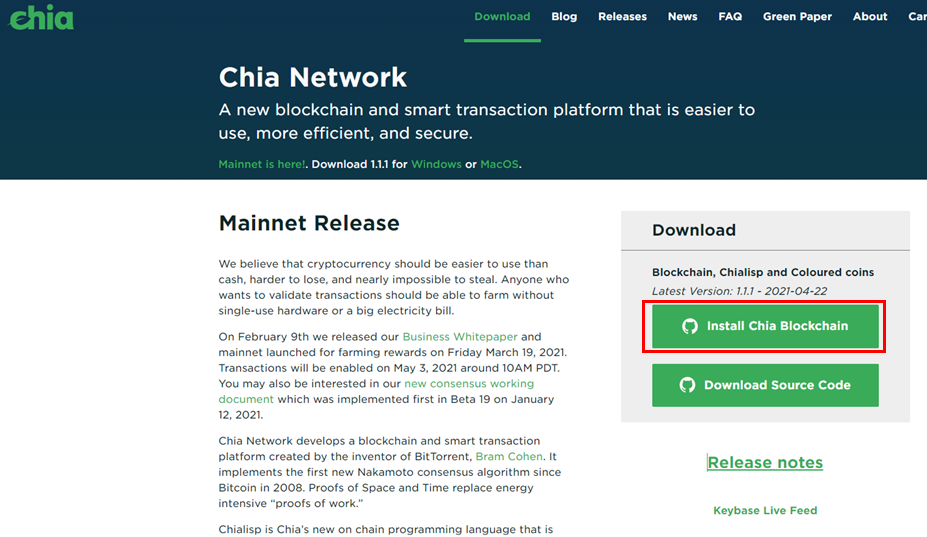 이미치처럼 "Install Chia Blockchain"을 클릭