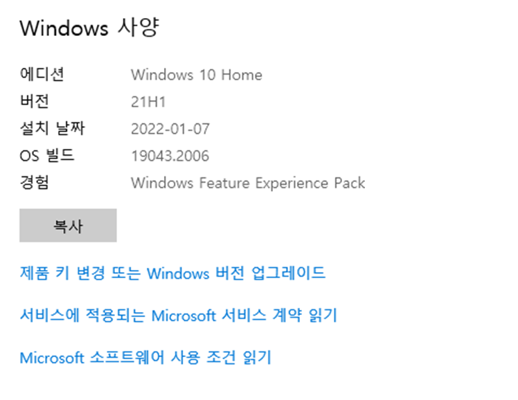 WIndows 사양 탭에 본인의 윈도우, 에디션, 버전 등의 정보가 표시됩니다.