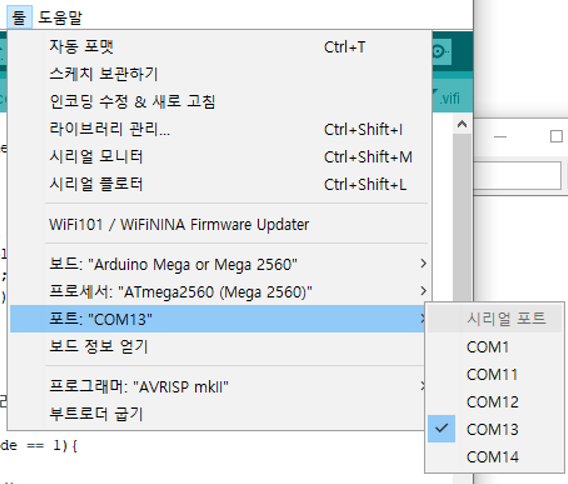아두이노 IDE 프로그램을 실행 후 다음과 같이 장치관리자에 뜬 포트번호만 설정합니다.