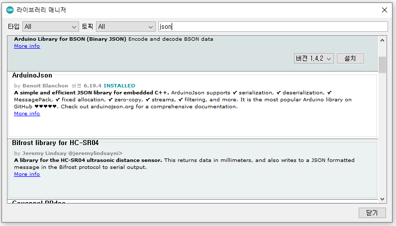 Json으로 검색하여 ArduinoJson을 설치합니다.
