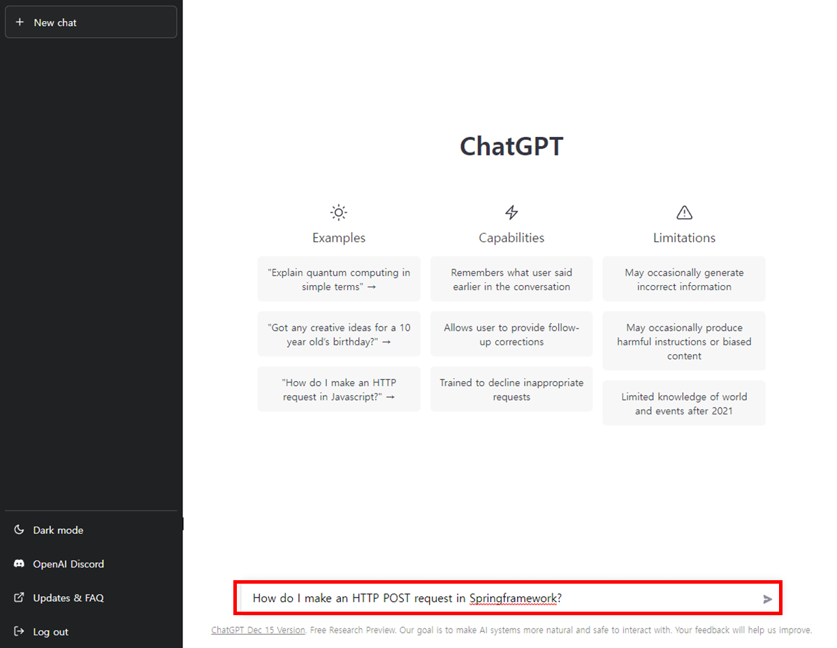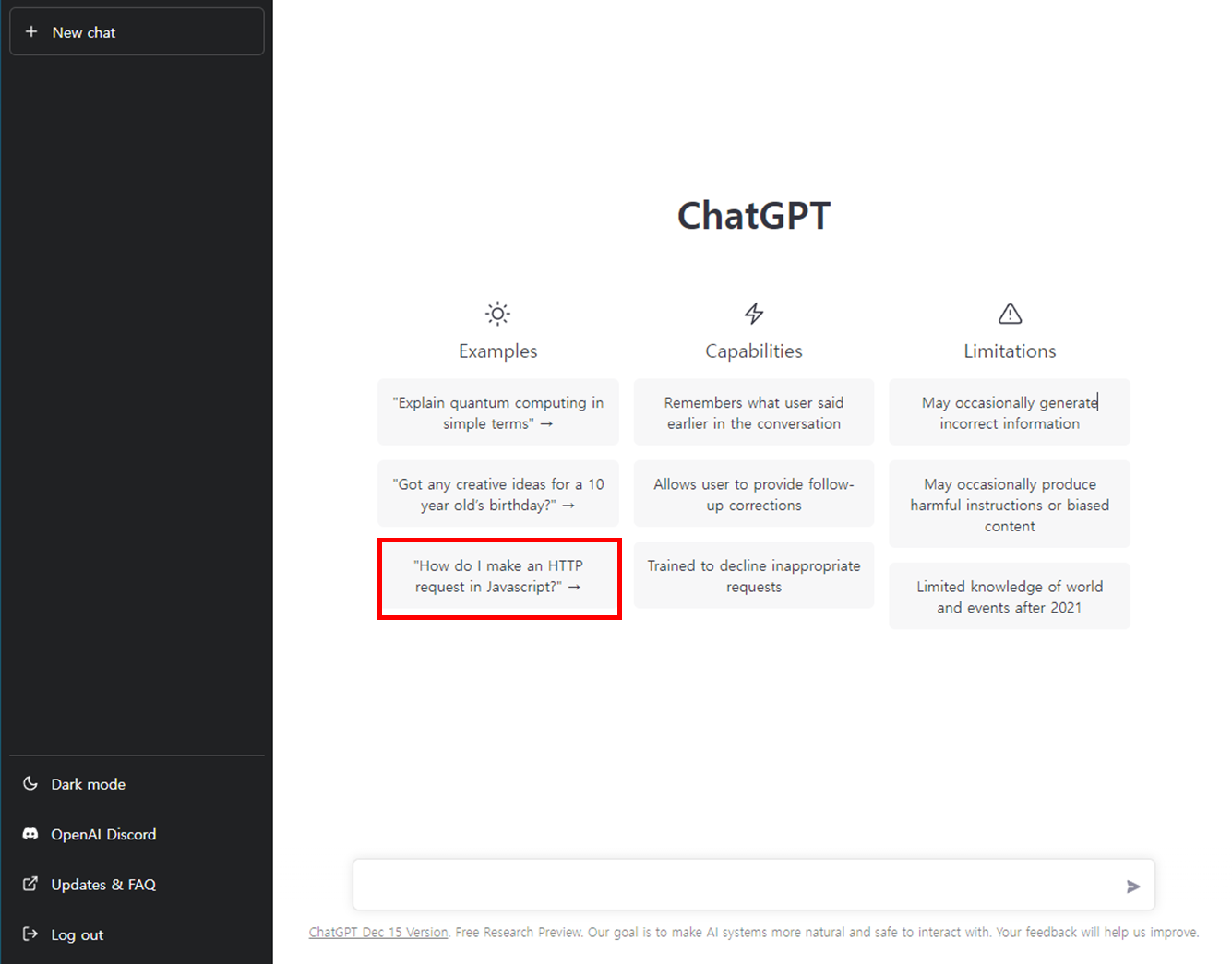 GPT 3.5를 기반으로 하는 대화형 인공지능. 간단한 회원가입 후 무료로 이용할 수 있다.