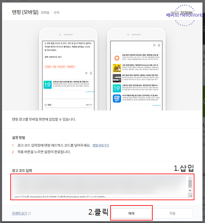 자 그리고 복사한 코드를 다음과 같이 광고 코드 입력에 삽입합니다.