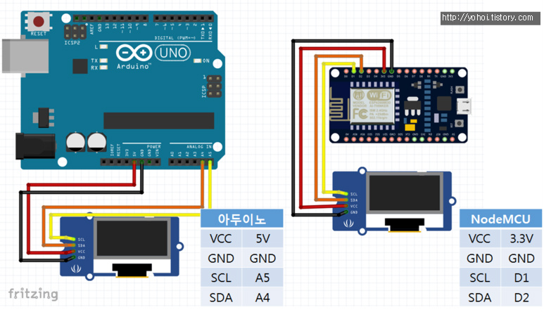 NodeMCU는 연결 방법만 그림과 같게 연결하시고 소스코드는 동일하게 사용하시면 됩니다.