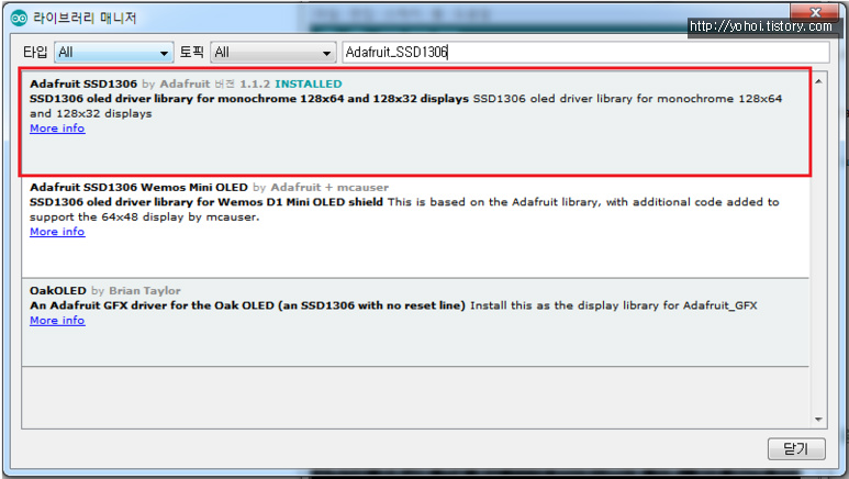 Adafruit_SSD1306를 검색하여 설치합니다.