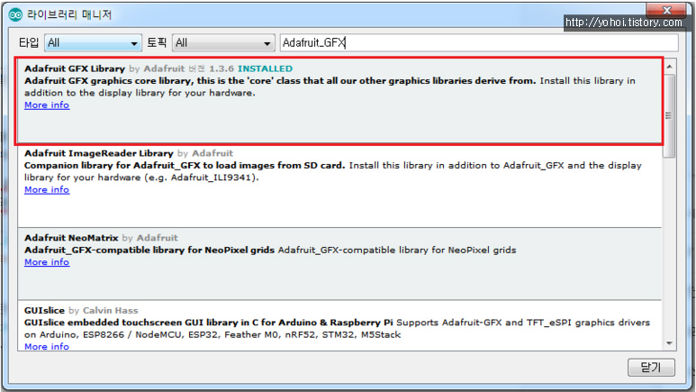 Adafruit_GFX를 검색하여 Adafruit_GFX Library를 설치합니다.
