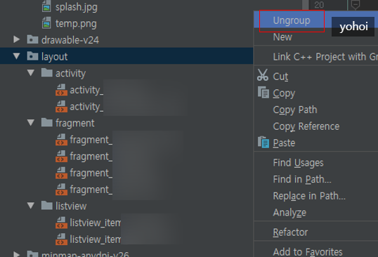 우선 이 방법은 project- android 가 아닌 project에서 project로 봤을 때 그룹화가 되는 단점이 있습니다.