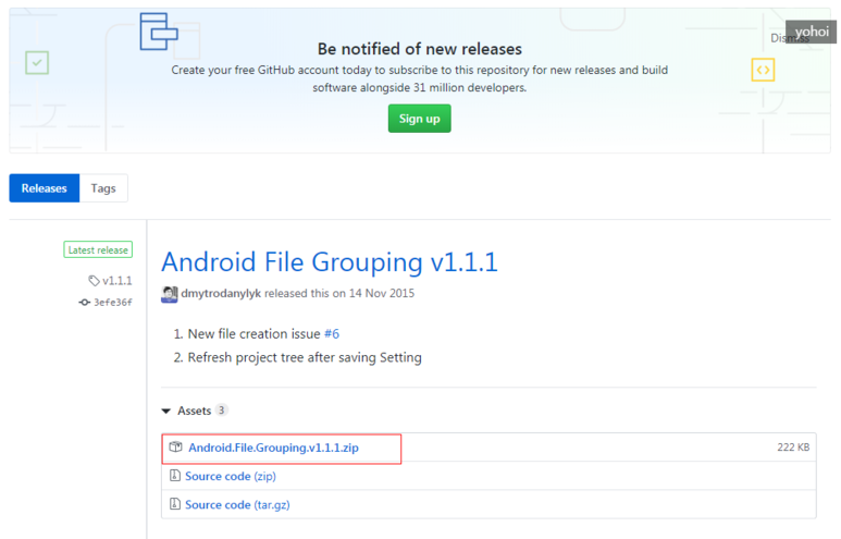 자 위의 Github 주소로 접속하셔서 다음과 같이 Android File Grouping v.xxxx의 최신 버전을 다운로드합니다.
