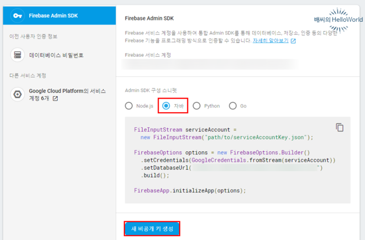 자바를 체크 -> 새 비공개 키 생성을 클릭합니다.