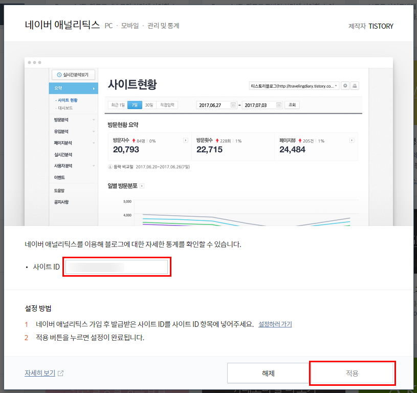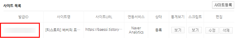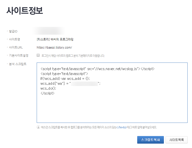 여기서 분석 스크립트를 티스토리 사이트에 삽입해야 합니다.