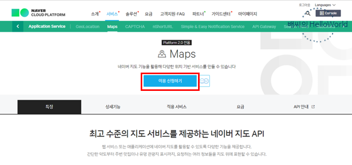 다시 네이버 클라우드 플랫폼의 Maps로 이동후에 이용 신청하기 버튼을 클릭