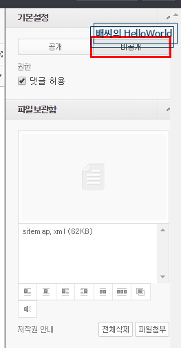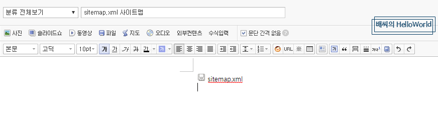 변경 후 글쓰기로 가서 sitemap.xml 파일을 업로드합니다.