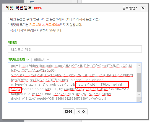 저는 정사각형의 이미지로 가로 최대 170px 크기를 지원하기 때문에 너비와 높이의 값을 170px로 변경했습니다.