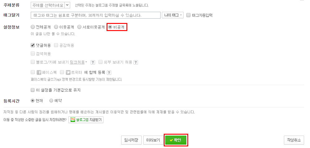 코드를 복사 후 게시글의 설정 정보에서 비공개로 선택하신 후 확인 버튼을 클릭합니다.