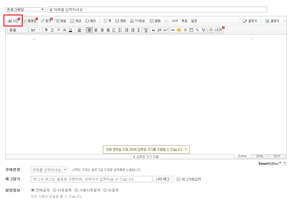 아래와 같이 구버전의 스마트 에디터 2.0의 글쓰기 화면입니다.