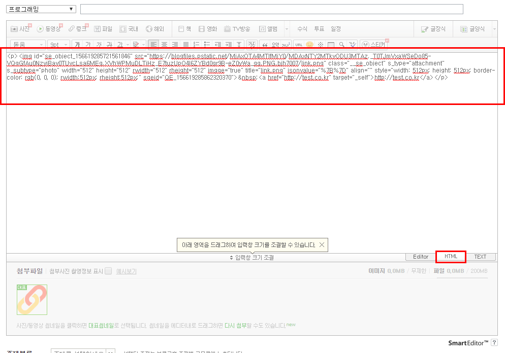 자 그리고 에디터 하단에 HTML을 선택하시면 다음과 같이 HTML 코드가 뜹니다.