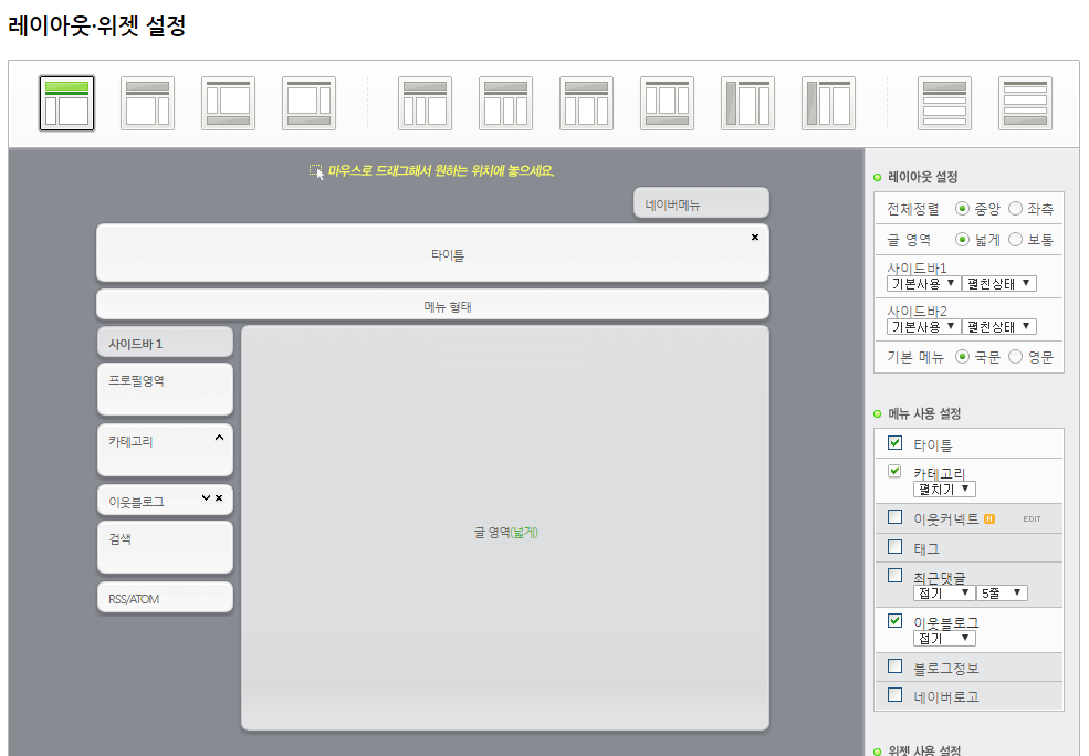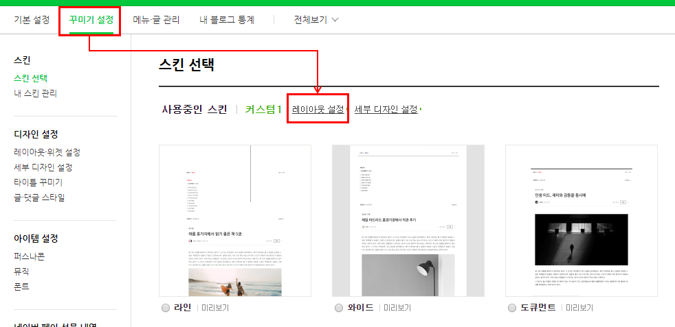 꾸미기 설정 - 레이아웃 설정으로 갑니다.